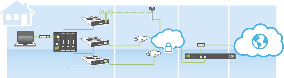 Mit Viprinet können Sie flexible Unternehmensnetzwerke mit hohen Bandbreiten und besonderer Ausfallsicherheit zu niedrigen Kosten einrichten, einfach indem Sie preisgünstige Consumer-Angebote wie DSL, UMTS/LTE, CDMA, aber auch Satellit nach Belieben miteinander bündeln.