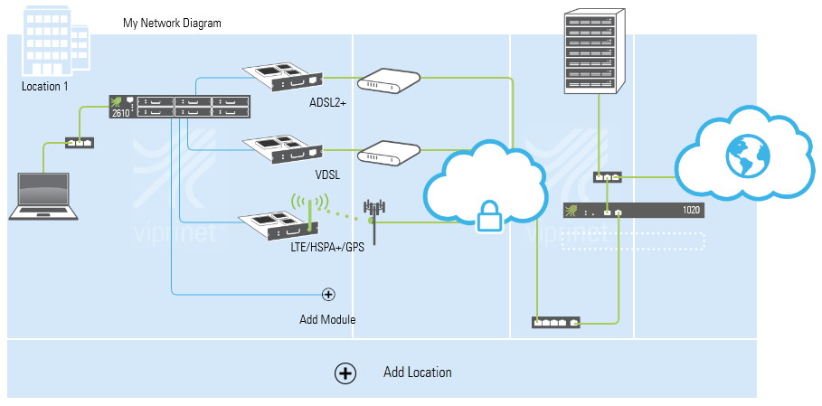 The Viprinet Infographics Generator helps you set up a network plan with Viprinet components. This tool contains all router and hub models as well as all module types to create a network plan according to any requirements. In addition, you may also depict multiple sites and specify them in regards to their locality (office or industrial building, vehicle, etc).